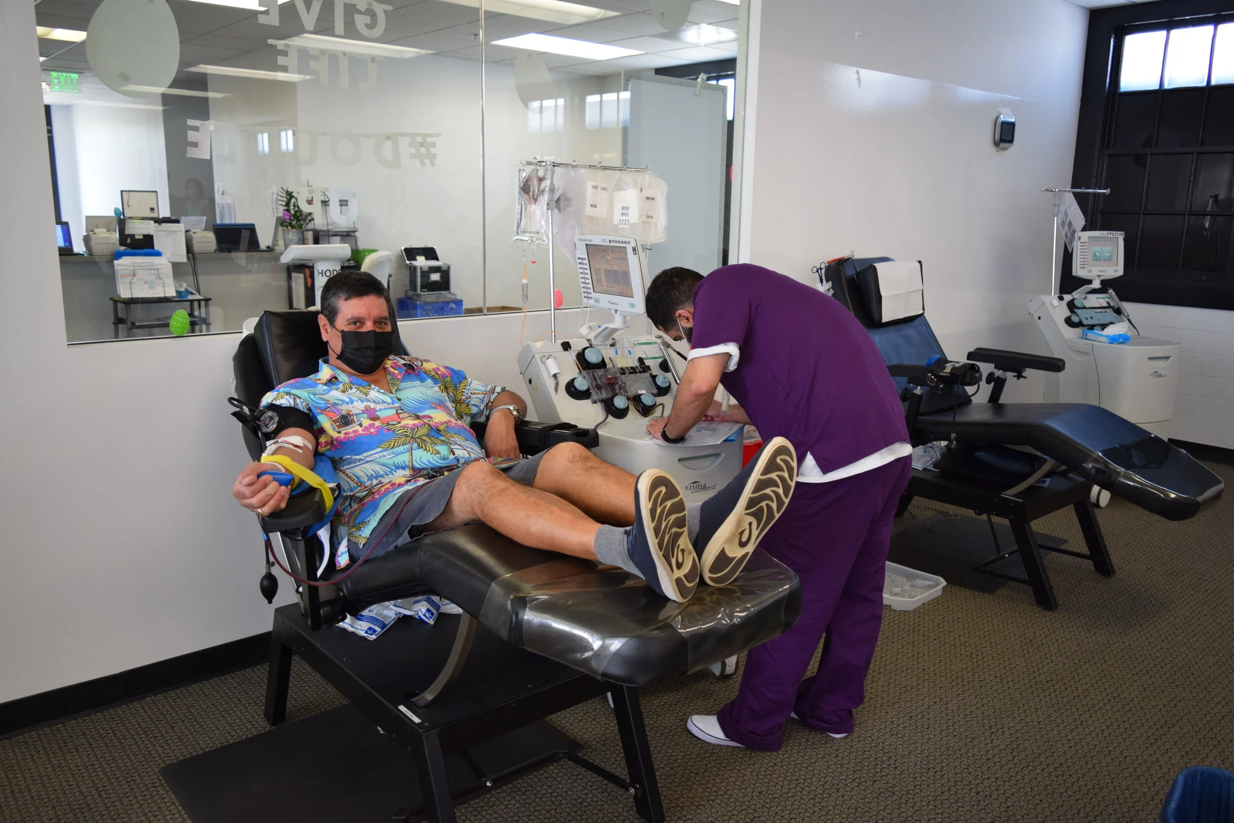 Lee donating platelets at SDBB’s temporary Liberty Station center.
