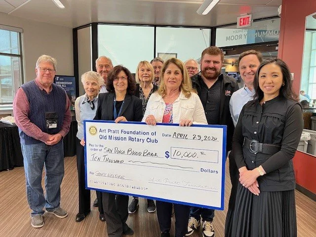 Photo: (L-R) The Art Pratt Foundation Board Members Don Krupp, Jackie Carpenter, Bob Chalfa, Old Mission Rotarian and SDBB Development Manager Susan Josephson, Old Mission Rotary President Stan Vogelsang, The Art Pratt Foundation Board Members Judi Copeland and Tom Sandler, Kimberly and Anthony Pretto, The Art Pratt Foundation President Lee Kaminetz and SDBB Director of Development Cherryl Castro-Lector.